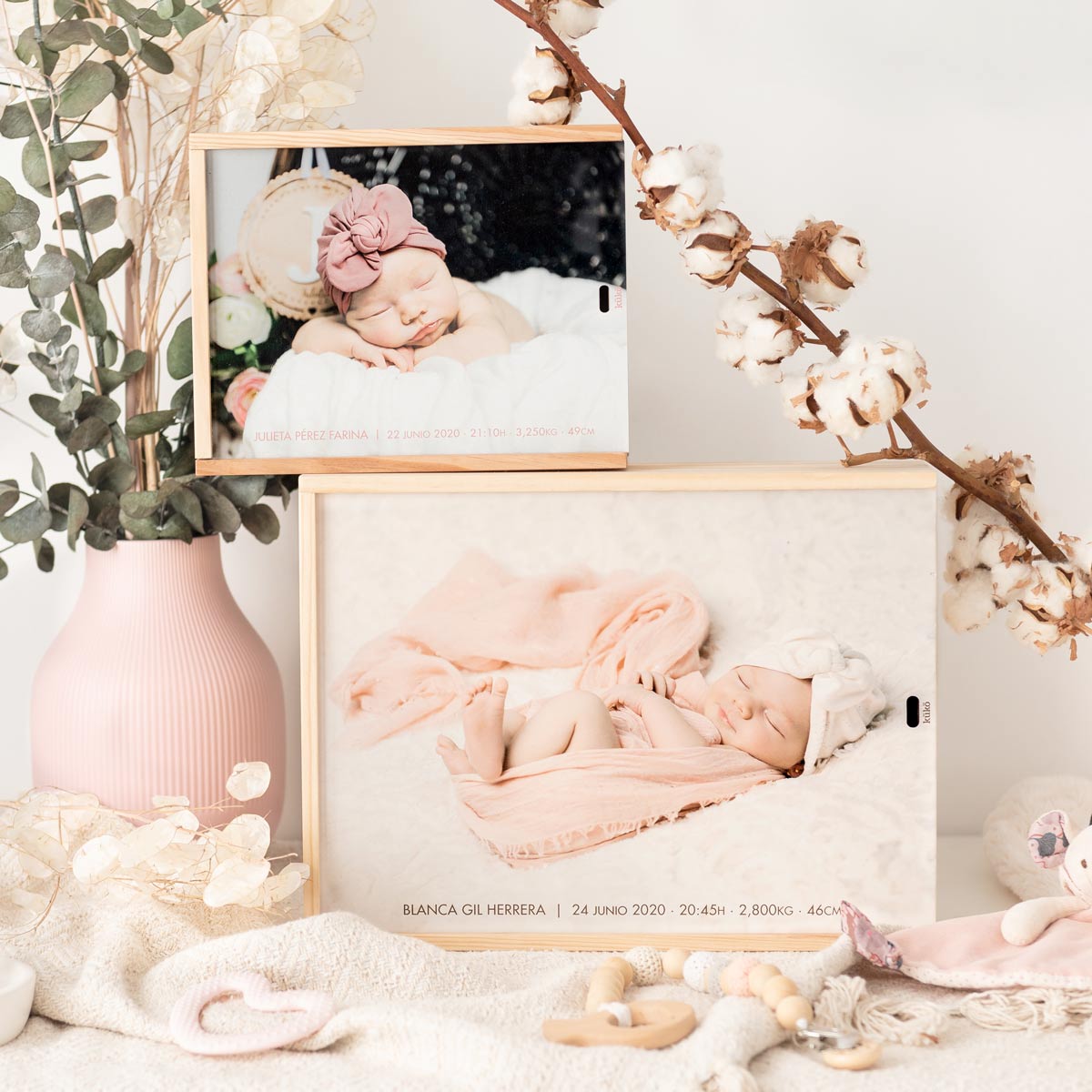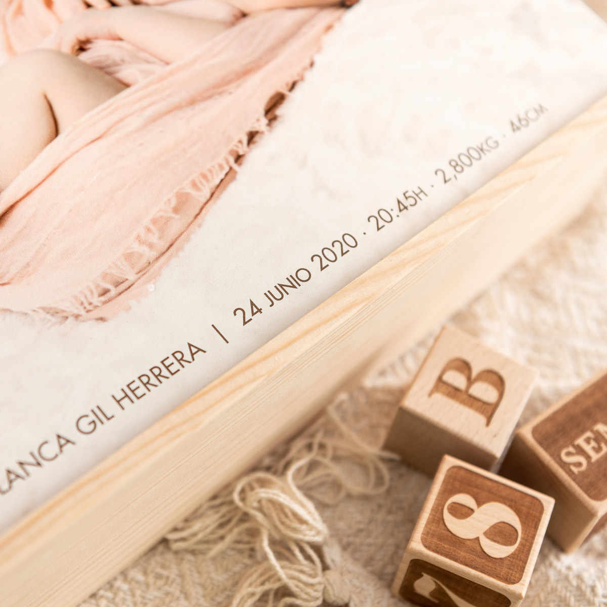Imprimiremos tu foto preferiada en la tapa de la caja, dejando un margen sin pintar para evitar que la foto se dañe con el roce. Además podrás añadir su nombre, nombre y apellidos y/o todos los datos del momento de su nacimiento.