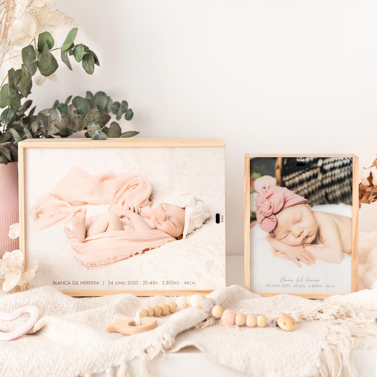 Caja de nacimiento con foto personalizable pintada directamente en la madera. Caja de madera robusta, ideal como regalo de nacimiento. Puedes llenarla con su primera muda, el gorrito del hospital, o llenarla con todo lo indispensable de kuko para recordar todos los momentos memorables como las tarjetas del primer año del bebé, el libro, un topper para el pastel de bienvenida, un nombre en madera de 30cm,..