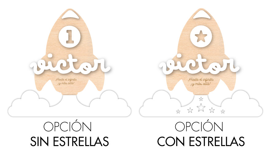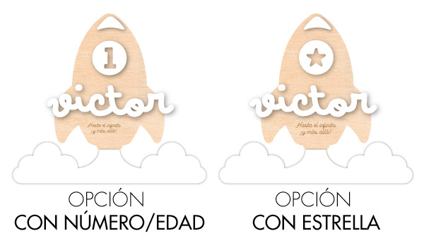 Puedes personalizar el Topper Cohete Madera con el nombre que quieras y el número (no es obligatorio). Puedes poner una frase dedicada en la parte inferior del topper, en la base del cohete.