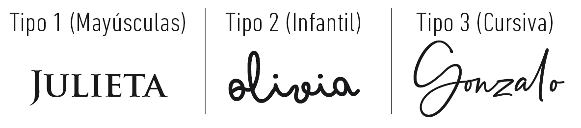 La Tipografía 01 (Mayúsculas) no podrá ir en minúsculas ya que esta tipografía no dispone de ellas. La Tipografía 02 (Infantil) siempre irá en minúsculas, no dispone de mayúsculas ni capitales. La Tipografía 03 (Cursiva) irá siempre con la primera letra en mayúsculas y el resto en minúsculas. Por favor, ten en cuenta que el texto y el diseño grabado será como muestran las fotografías con el mismo estilo que se muestra en las imágenes. Al tratarse de madera natural, la pieza puede presentar vetas, nudos o tonalidades ligeramente distintas a las que muestra la imágen. Así mismo, el grabado puede variar su profundidad y color en función del veteado de la misma madera.
