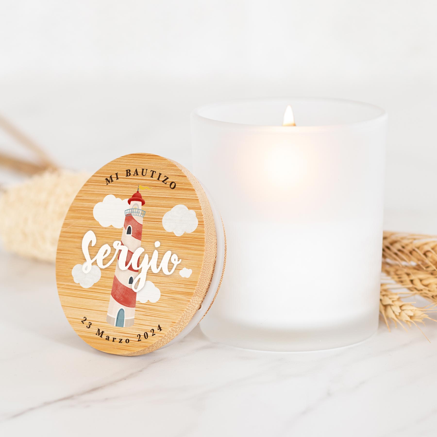 Vela Cristal Bautizo con tapa de bambú pintada, personalizada con el diseño “Faro” by kuko – Vela de cristal helado con tapa de bambú y aroma a Vainilla.